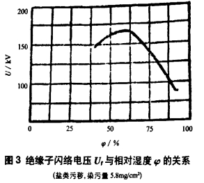 电缆分支箱地处交通要道,背靠山坡,面向公路,尘土很大,绝缘子表面的积尘较多,在污层受潮时。其间所含可溶性盐类及酸碱成分溶解于水中,使表面电导率骤增,泄露电流许多增加,大大下降闪络电压。一般说来,绝缘子的污闪电压随其污染程度的增加而下降。污染严峻时,跟着污染程度继续增加,污闪电压的下降已很缓慢,但这时污闪电压常常现已低于作业电压了。单调污秽的电阻较大,它并不下降绝缘子的闪络电压,一般当空气相对湿度小于50%~70%时,沿面闪络电压不会下降;高于这数值时,跟着湿度增加,闪络电压敏捷下降,如图3所示。实践作业中,绝缘子污闪事故都发生在雾、露、阴雨连绵等高湿度的气候.由于在这种条件下、积尘中水深性的盐类溶解,使污层成为了半导体,大大增加泄露,下降闪络电压。本次事故正值当地千载一时的大雨期间,而开关柜柜体的密封较差,柜内相对湿度已达90%以上,开关柜的操作安排安排严峻腐蚀,以至于彻底不能正常操作,由脏污沿面放电的进程的评论可知,污层的电阻越大,泄露电流越小,放电翻开越困难,闪络电压也相应行进。在相同污染和湿润条件下,介质表面形状、南北极间的沿面最短距离即泄露距离是影响表面电阻和闪络电压的重要要素。泄露距离增加,污闪电压也增加。不同成都的污秽情况对线路及变电站绝缘的影响程度是不同的,因而应依据不同的污移情况,选用相应的绝缘标准保证电网安全作业"。现在,我们用泄露比距来估计脏污条件下绝緣子的耐污功用。由于我局所辖电网为渝中区,被定为三级污区,按变电站设备考虑泄澜比距应大于4cm/MkV。